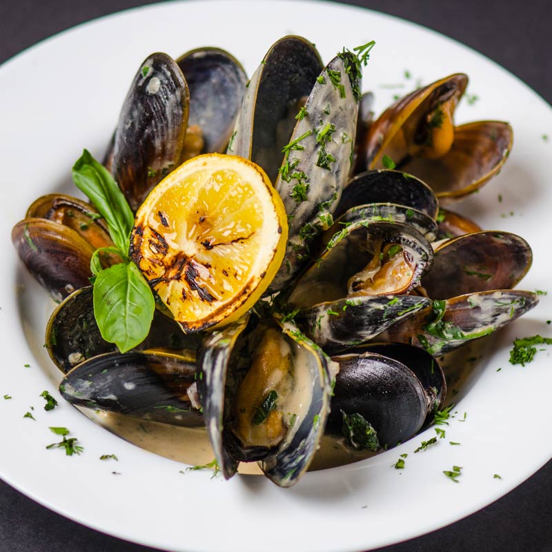 - St. Jacob's grilled mussels with minted pea purée and smoked pancetta